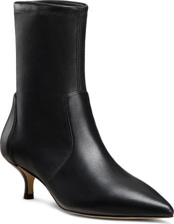 A pointy toe and kitten heel balance a Spanish-made leather bootie fashioned with a sock-like upper for easy entry.