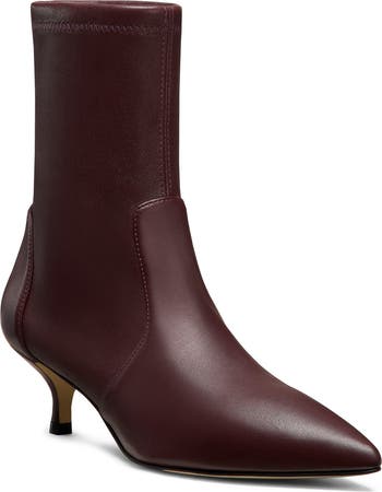 A pointy toe and kitten heel balance a Spanish-made leather bootie fashioned with a sock-like upper for easy entry.