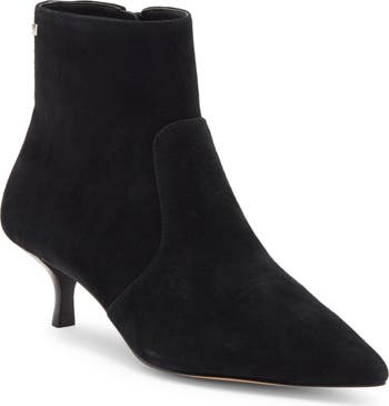 Raised seams and a streamlined profile add contemporary elements to a Spanish suede bootie lofted by a demure kitten heel.