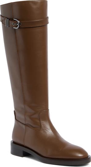 A buckle strap accents the straight topline of a moto-chic boot rendered in supple leather and grounded by a sturdy rubber sole.