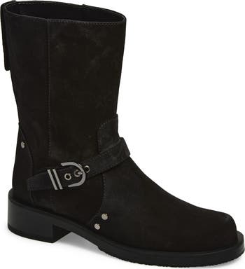 A buckle strap bridges the notched topline of a moto-chic bootie rendered in supple suede and grounded by a sturdy rubber sole.