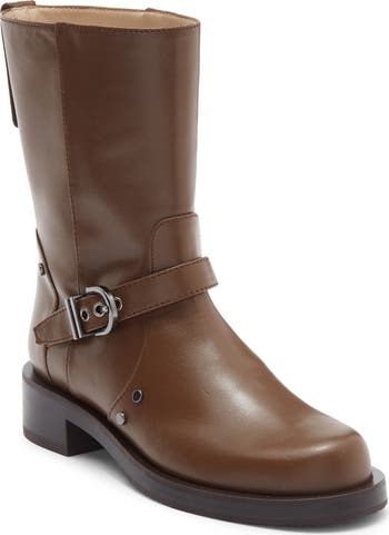 A buckle strap bridges the notched topline of a moto-chic bootie rendered in supple suede and grounded by a sturdy rubber sole.