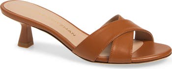 Sleek crossover straps and a curved kitten heel define a minimalist slide sandal carefully crafted in Spain.