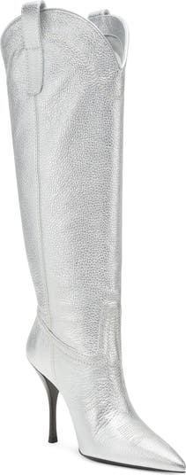 Tonal stitching, a pointy toe and a curved topline add hints of Western style to an outfit-defining knee-high boot with a gleaming metallic finish.