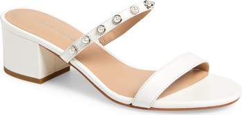Lustrous faux pearls enrich the strap of a party-ready slide sandal lifted by a wrapped block heel.