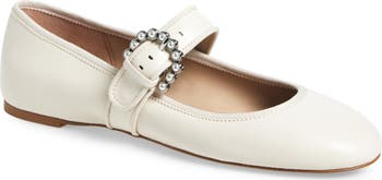Lustrous faux pearls outline the circular buckle of the vamp strap of this endlessly charming Spanish-leather flat.