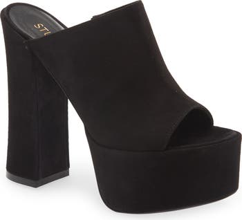 A soaring platform and block heel lend showstopping height to a retro-inspired sandal rendered in supple suede.