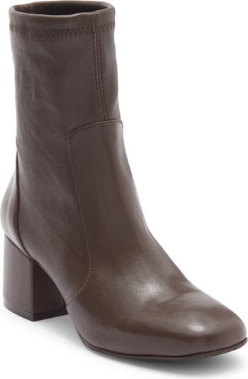 A squared-off toe and block heel balance a sleek leather bootie fashioned with a stretchy sock-like shaft for easy entry.