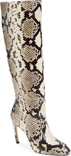 A pointy toe and stiletto heel balance a snakeskin-embossed leather boot fashioned in a knee-high silhouette with a side zipper for easy entry.