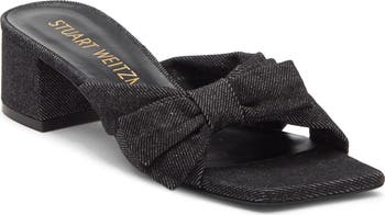 A folded bow centers this woven raffia slide sandal lifted by a block heel for a striking look.