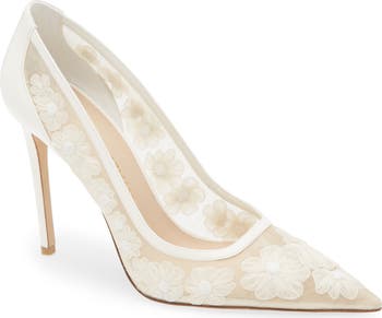 Ethereal floral appliqués make an enchanting statement against the mesh upper of a pointy-toe pump lifted by a svelte stiletto heel.