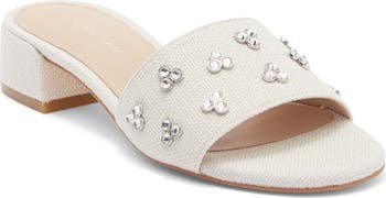 Bezel-set crystal embellishments adorn the summery silhouette of this slide sandal lifted by a low stacked heel.