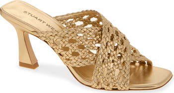 Wide, intricately braided straps crisscross over the vamp of a Spanish-made slide sandal cast in metallic leather and lofted by a sculptural flare heel.