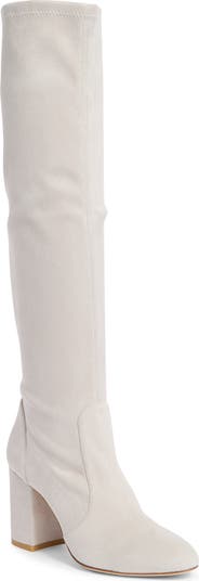 An almond toe and wrapped block heel balance a knee-high leather boot fashioned with a stretchy shaft for easy entry.