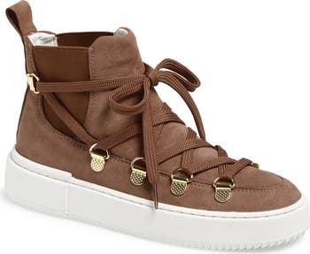 Wide-spanning laces and gleaming D-ring eyelets modernize the high-top silhouette of a suede sneaker that's a standout addition to your look.