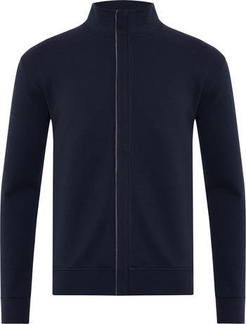 Stay warm and comfortable on chilly days in this stretch-knit cotton sweater with a quarter-zip closure and suede shoulder panels.
