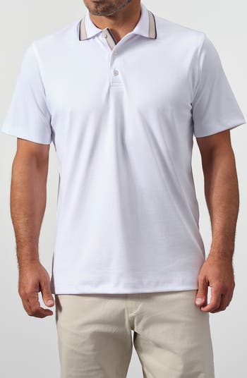A cotton-blend knit polo with contrast tipping makes for a classic staple.