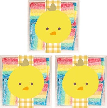 Chick picks—these sweet and sour, fruit-flavored rainbow gummies are dusted in tart sugar crystals—a treat every little chick will love.
