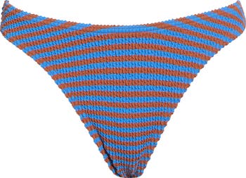 A tanga cut and high waist lend retro style points to bikini bottoms covered in stripes to sweeten your beach-day looks.