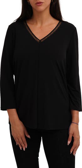 Perfect for everyday wear, this soft jersey top is framed by a lace-trimmed V-neck and three-quarter sleeves.