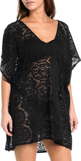 Go from beach to boardwalk in this cover-up caftan crocheted from soft cotton yarn offering a breezy fit.