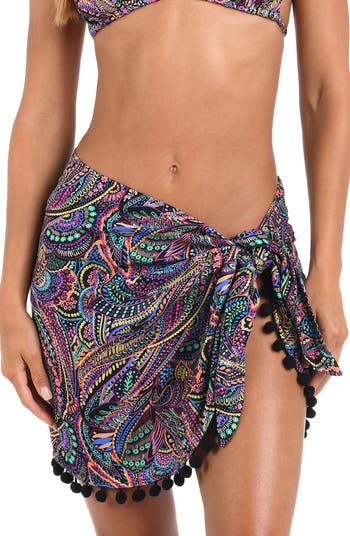 A neon-bright paisley print pops against a black background on this sunshine-approved pareo trimmed with playful pompoms.