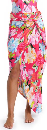 Blooming tropical flowers amplify the breezy vibe of a resort-ready faux wrap topped with an elastic band that makes it easy to style as a skirt or dress.
