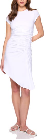 An asymmetric hem and generous scrunching delivers a dramatic finish to a comfortable stretch-knit dress.