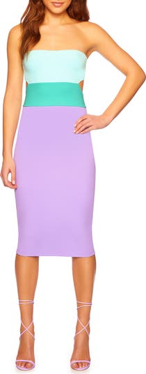 Things are heating up in this vibrantly color-blocked midi styled with an airy back cutout and tan-friendly strapless neckline.