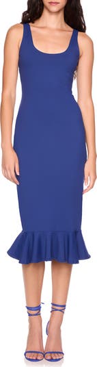 This curve-hugging dress made from a vibrant stretch knit flares out to a midi length with a fluttery ruffled hem.
