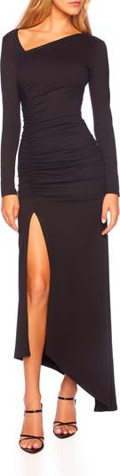 Turn heads in this alluring long-sleeve maxi dress fashioned with gathered ruching and a thigh-high slit that drifts into an asymmetric high-low hem.