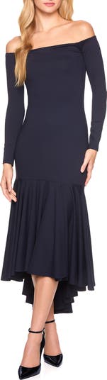 Cut from the brand's signature stretch fabric for a close fit, this shapely shoulder-baring dress is finished with a fluttery high-low hem that sways with every step.