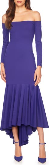 Cut from the brand's signature stretch fabric for a close fit, this shapely shoulder-baring dress is finished with a fluttery high-low hem that sways with every step.