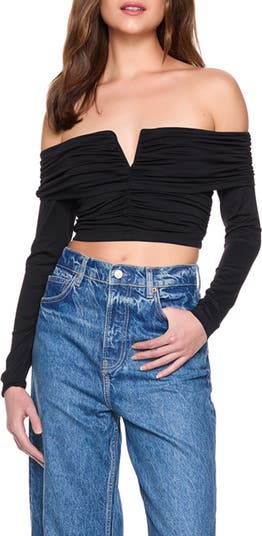 Dramatic yet elegant, this ruched top features an off-the-shoulder neckline with a V-wire notch and a cropped silhouette.