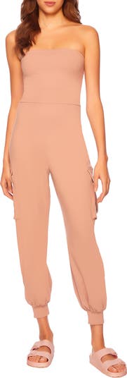 Elevate your night-out look with this stretchy strapless jumpsuit that embraces the utility trend with cool cargo pockets at the legs.