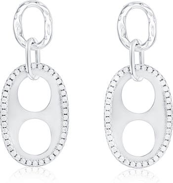 A halo of cubic zirconia amplify the bright shine of geometric drop earrings done in a sterling silver setting hand-polished to perfection.