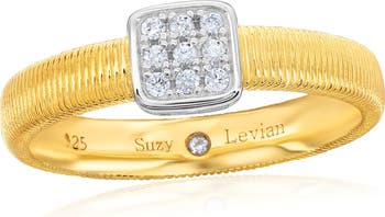 Pavé cubic zirconia stones encrust the square accent of this textured-rib ring perfect for daytime or evening wear.