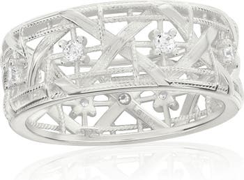 A geometric-cutout design defines this wide band ring inset with cubic zirconia stones.
