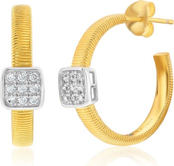 Brilliant pavé cubic zirconia stones front these textured huggie hoops perfect for daytime or evening wear.