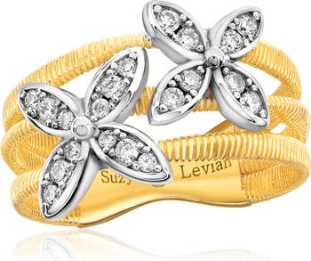 A duo of pavé butterflies rests on the top of this triple-coiled ring done in a twisted rib design to catch light at every angle.