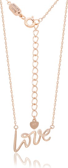 A rose goldtone plate adds a gleaming finish to a love script pendant necklace made of fine sterling silver.