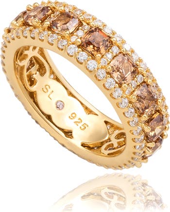 Brown asscher-cut and white round-shaped cubic zirconia stones encrust a band ring made from sterling silver in 14-karat gold plate.