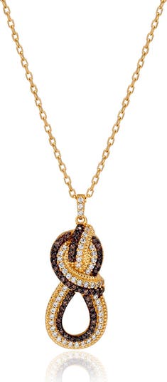 Pavé brown and white cubic zirconia bring luxurious sparkle to this twisted knot pendant necklace crafted from sterling silver with a warm goldtone finish.