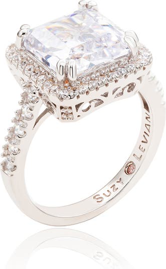 Show off glamorous sparkle with a sterling silver ring featuring an asscher-cut cubic zirconia with a pavé cubic zirconia halo and embellished band.