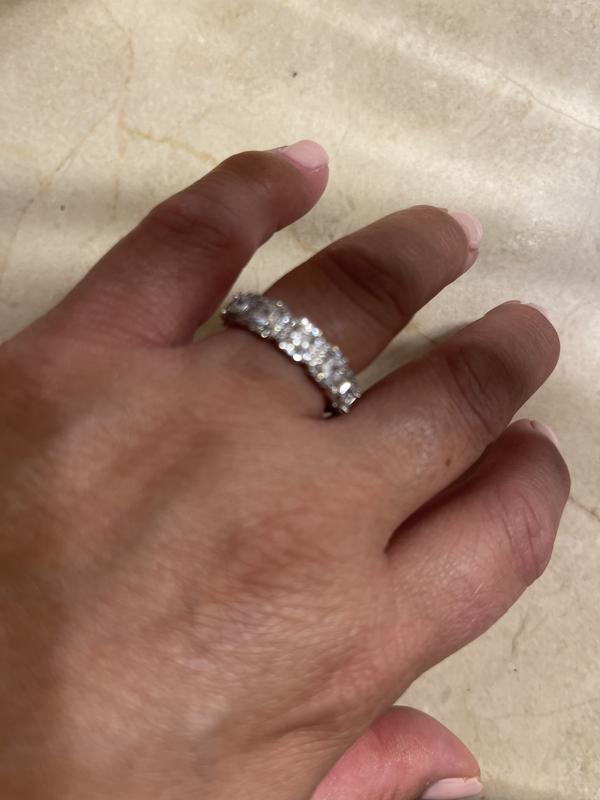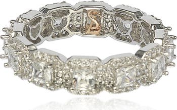 Asscher cut white cubic zirconia, set in halos of pave round cut cubic zirconias. Crafted of sterling silver with a rose plated SL logo and closed gallery inside for comfort fit. It's the perfect eternity band for all occasions.