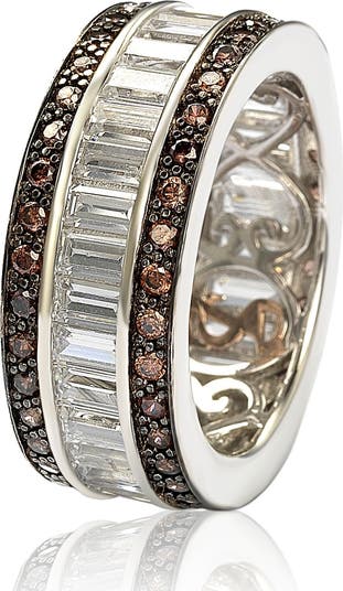 A delicious mix of colors that will last an eternity. This ring is filled with rich, tasteful color and modern fashion, featuring white pave cubic zirconia set between two rows of channel-set chocolate brown baguette cubic zirconia, hand set in 925 sterling silver. Surprise someone special in your life with this luxurious anniversary ring. Brown and white round and baguette-cut gemstones set in high-polish sterling silver setting create a ring that's not only strikingly gorgeous but reminds your special someone that your love lasts for all eternity! This ring is designed by Suzy Levian with a message. By creating jewelry that is beautiful inside and out, Suzy Levian's message is revealed through a hidden gemstone set in the shank of this ring to empower women to discover their inner strength, power and beauty. This ring has a closed under-gallery for comfort fit with a two-tone setting, highlighting Suzy Levian's SL logo. 'Together we can inspire the world to appreciate the diamond in ourselves.' - S.L.