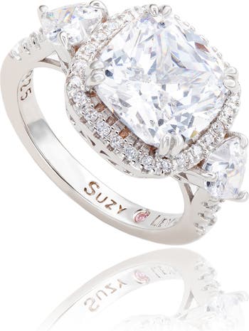 Handcrafted from shining sterling silver, this bridal ring features an array of glittering white CZ stones surrounding a cushion-cut center stone.