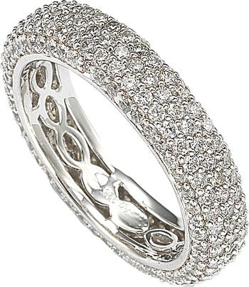 Pavé cubic zirconia bring glamorous sparkle to a polished sterling silver eternity band ring.