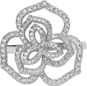 Pavé CZ brings elegant sparkle to this sterling silver ring crafted in a charming floral silhouette.