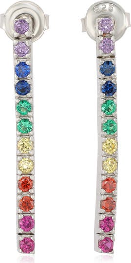A slim line of rainbow CZ adds playful sparkle to these sterling silver linear drop earrings.